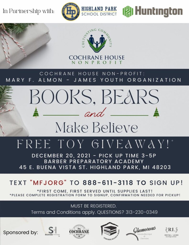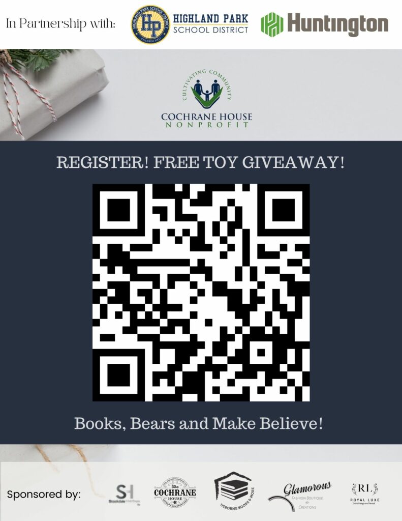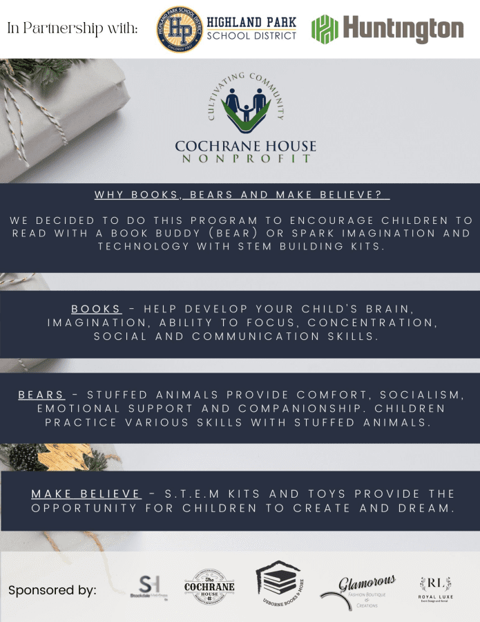 The School District of the City of Highland Park Board of Education partnered with The Cochrane House and Huntington Bank to sponsor a Books, Bears & Make Believe Holiday Giveaway for the Scholars and families of Barber Preparatory Academy on Monday, December 20, 2021 from 3PM to 5PM. Registration is required. First come, first served while supplies last. Text “MFJORG” to 888-611-3118 to sign up!